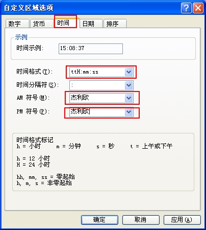 “选项”-----“自定义”----“时间”----时间格式(T)里的H:mm:ss前加两个 tt,ttH:mm:ss ,如果你想让你喜欢的名字在时间的后面显示 ,你可以把tt打在后面,H:mm:sstt。然后在AM符号(M):里填上你喜欢的名字,在PM符号(P):里也填上你喜欢的名字。