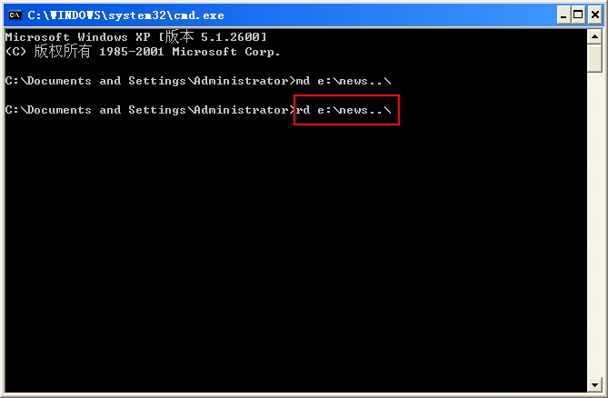 在CMD模式下,使用MD 命令建立文件夹,键入“md e:\news..\”,引号里的,注意,有二个点哦。回车后就可以看到在E :盘下有news.命名的文件了。。