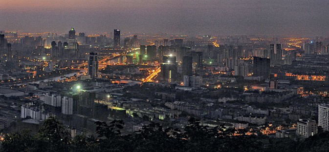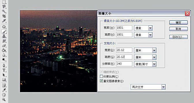 | 1、我们这里选择的图片是一张夜晚的全景图片。所以首先要对图片进行裁切。截取灯光比较密集,光线比较亮的地方。注意天空的比例尽量小一些。 |