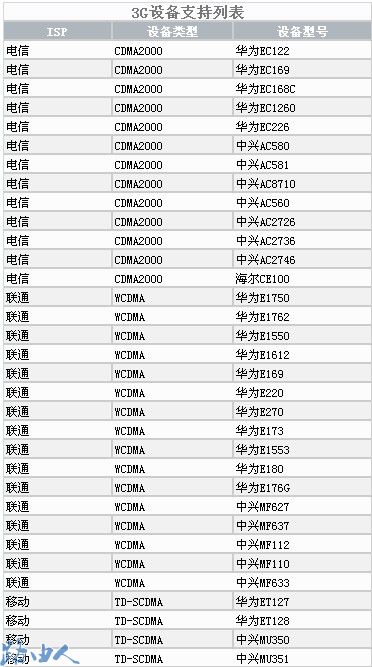 四、点击支持列表,可显示目前飞鱼星路由器支持的3G网卡