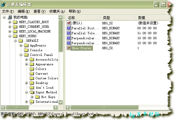 4,开始--运行--regedit 然后找到“HKEY_USERS\.DEFAULT\Control Panel\Input Method”分支,将右边窗口中的