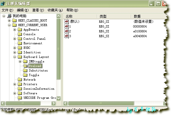 2,用注册表修改输入法文件,打开开始--运行--regedit 找到HKEY_CURRENT_USER\Keyboard Layout\Preload
