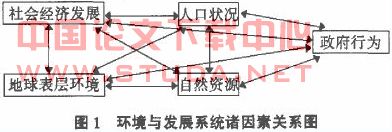 当然这一阐释还是很初步的。1994年,为参加陕西师范大学与美国北依阿华大学联合在西安举行的“环境保护与可持续发展国际学术会议”,笔者在提交会议的论文《制定并执行正确的政策是做好环境保护工作的基点——以中国黄土高原地区水土保持工作为例》中,就当今全球普遍面对的“环境与发展”难题,依据前述人地关系是一“多元复合双向制约体系”的理论观点,拟定了一个环境与发展人地关系系统诸因素相互制约影响之模型图。见下图: