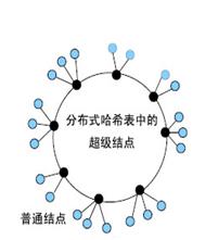我们改进了分布式哈希表(DHT)的设计。一个极端是,这个分布式哈希表可以在服务器中用于服务器的领域同时仍然管理客户/服务器结构。另一个极端,所有的结点成为分布式哈希表的一部分。我们选择如图1所示的一种中间设计,具有高的容量(带宽,CPU,内存)和可用性(正常运行时间,公共IP地址)的一些结点成为超级结点并组成分布式哈希表,而其他的普通结点与一个或更多的超级结点相连而不是成为分布式哈希表的一部分。