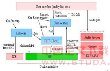 协同工作:不像Skype[7]之类的其他P2P系统,我们使用SIP与其他端点通讯。这可以很容易的与任何现存的SIP-PSTN网关的IP电话结构或象Asterisk的基于服务器的IP PBX一起工作。