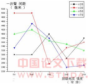为 50A 时出现最大值,随后不断减小甚至出现小于未加磁场时的情况。随着牵引速度的增 大,参看 40、50、70、100µm/s 曲线,一次臂间距呈现出震荡增大现象,总体上看一次臂间 距随外磁场增大而不断增大,但增大过 程是反复波动的,每次出现极大值后必然仅随出现